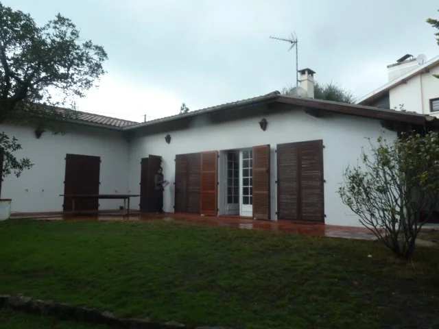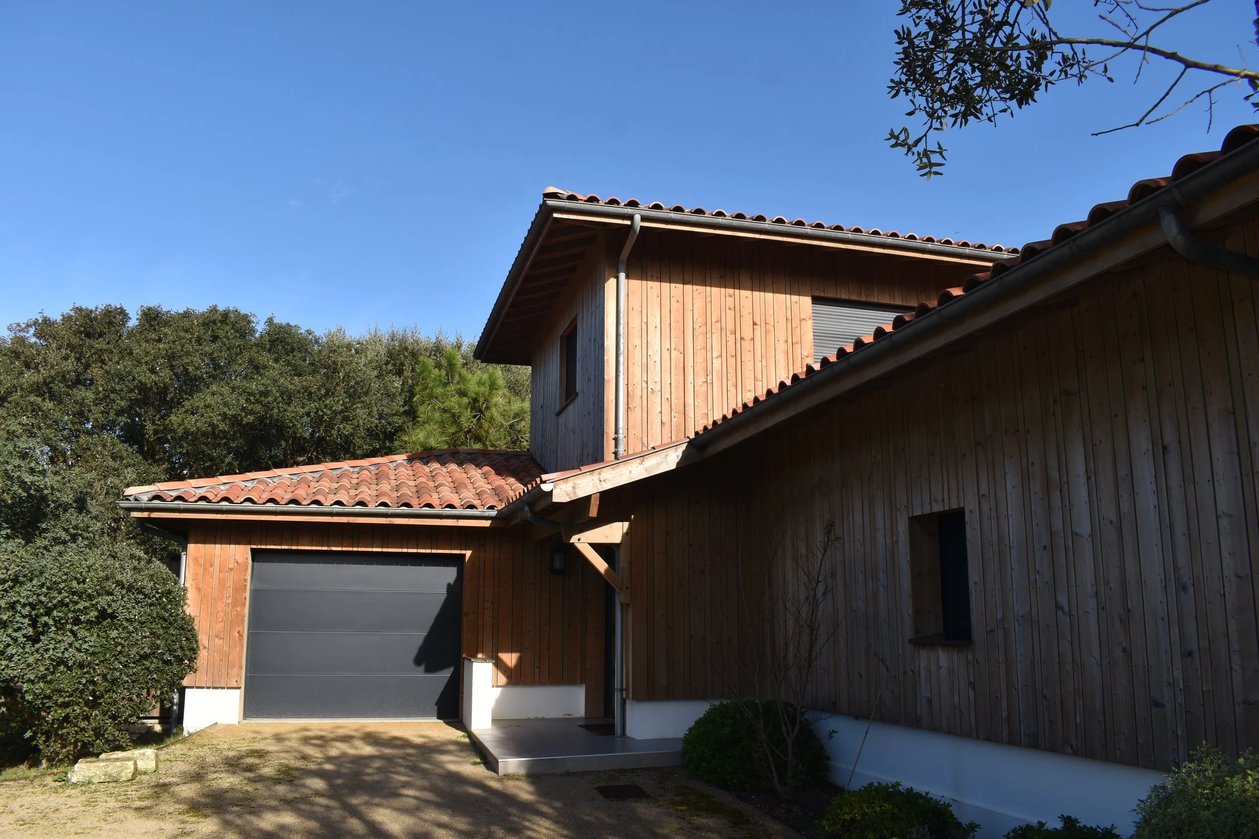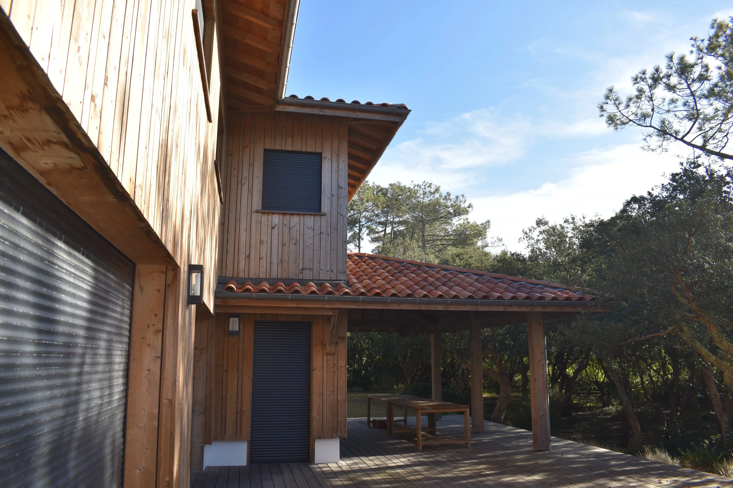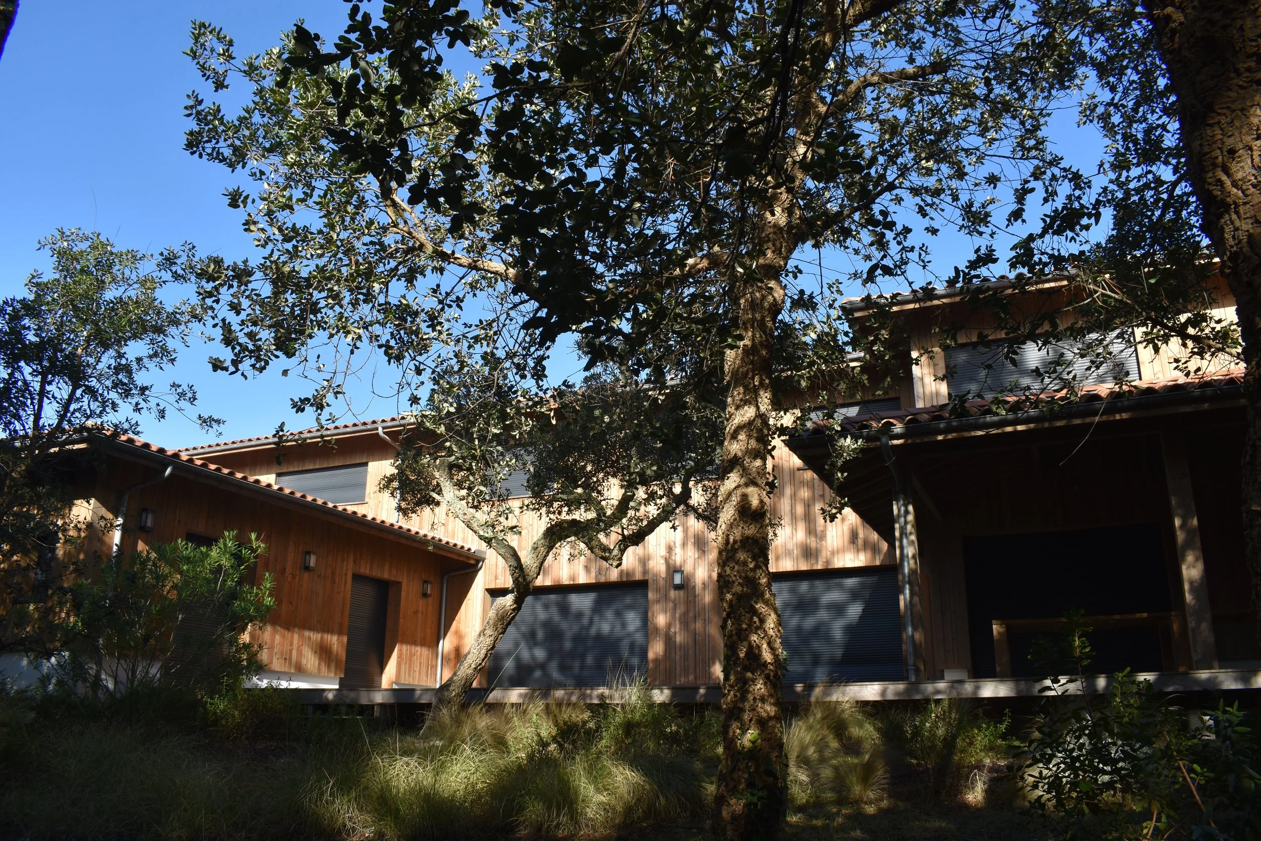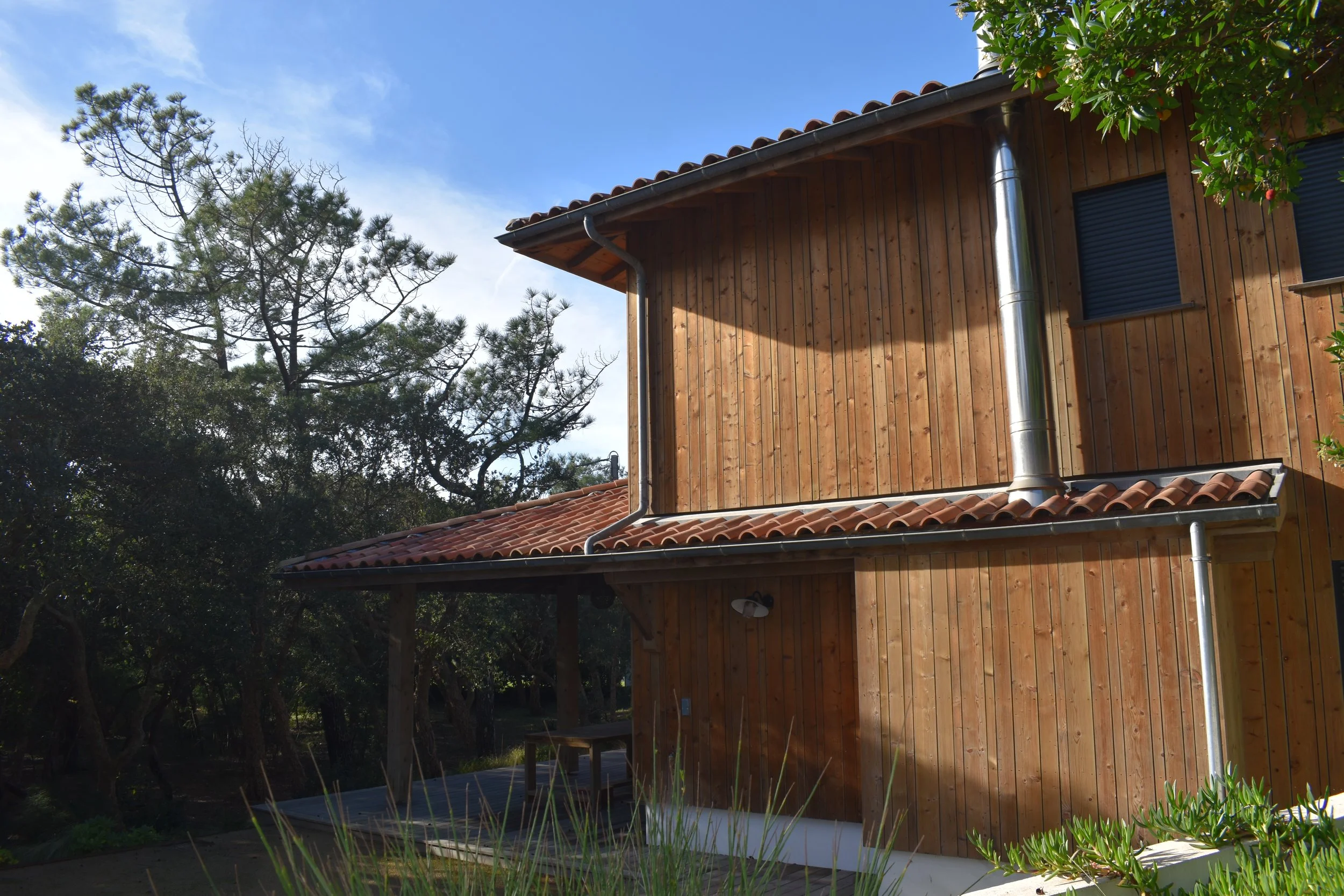 Maçonnerie traditionnelle en rez-de-chaussée et ossature bois à l’étage avec un habillage en pin traité pour l’ensemble de la maison. Nous nous sommes totalement adaptés à la flore présente et avons construit autour des chênes lièges du jardin, dans le but de respecter cette variété emblématique des Landes qui donnent tout son charme à notre construction moderne.